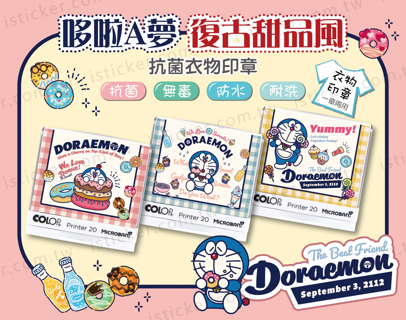 哆啦A夢 復古甜品風 抗菌衣物印章(含德國紡織印油印台)