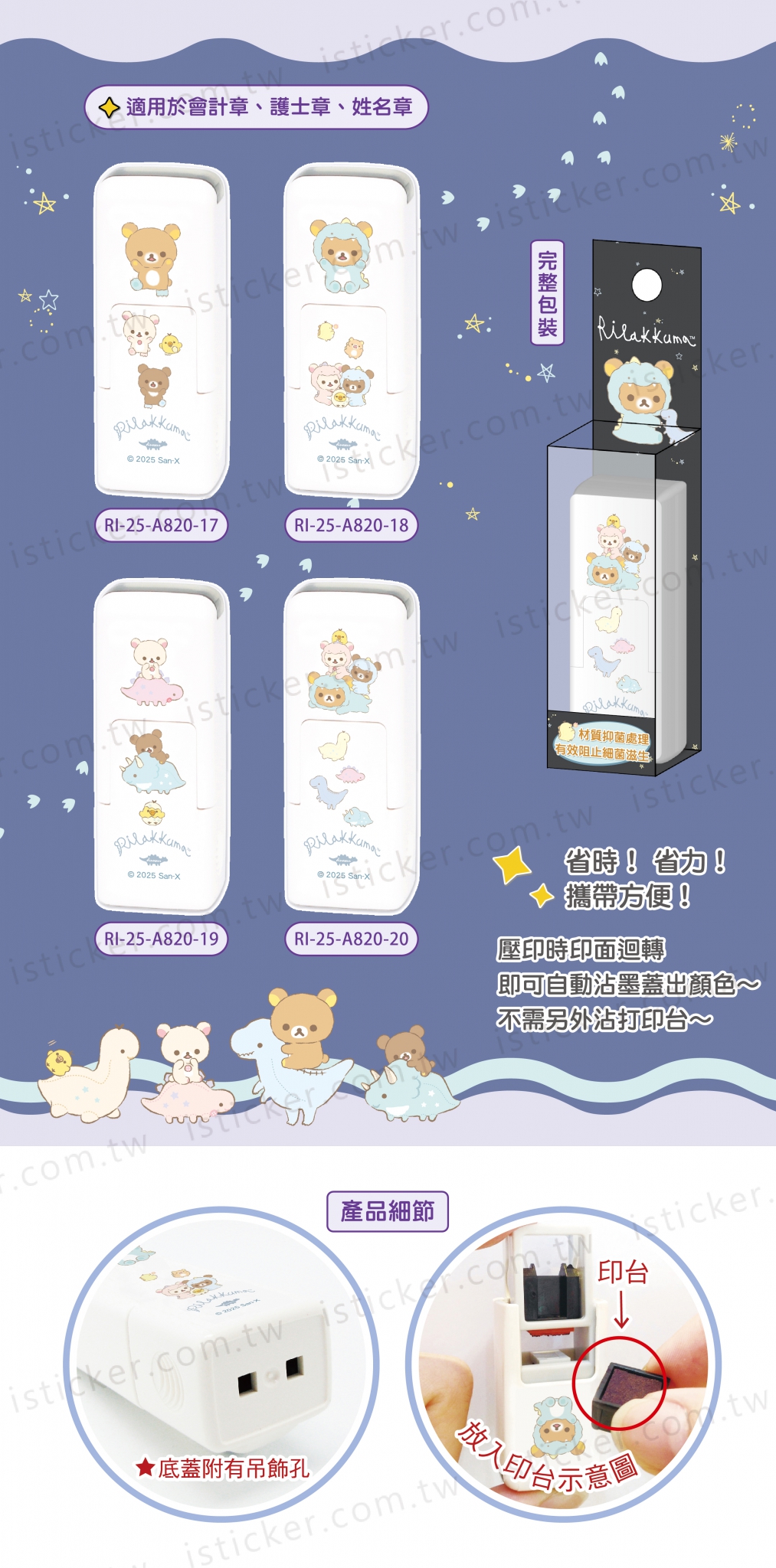 省時、省力、攜帶方便、實用、可愛,適用於會計章、護士章、姓名章,不需要另外沾打印台。
